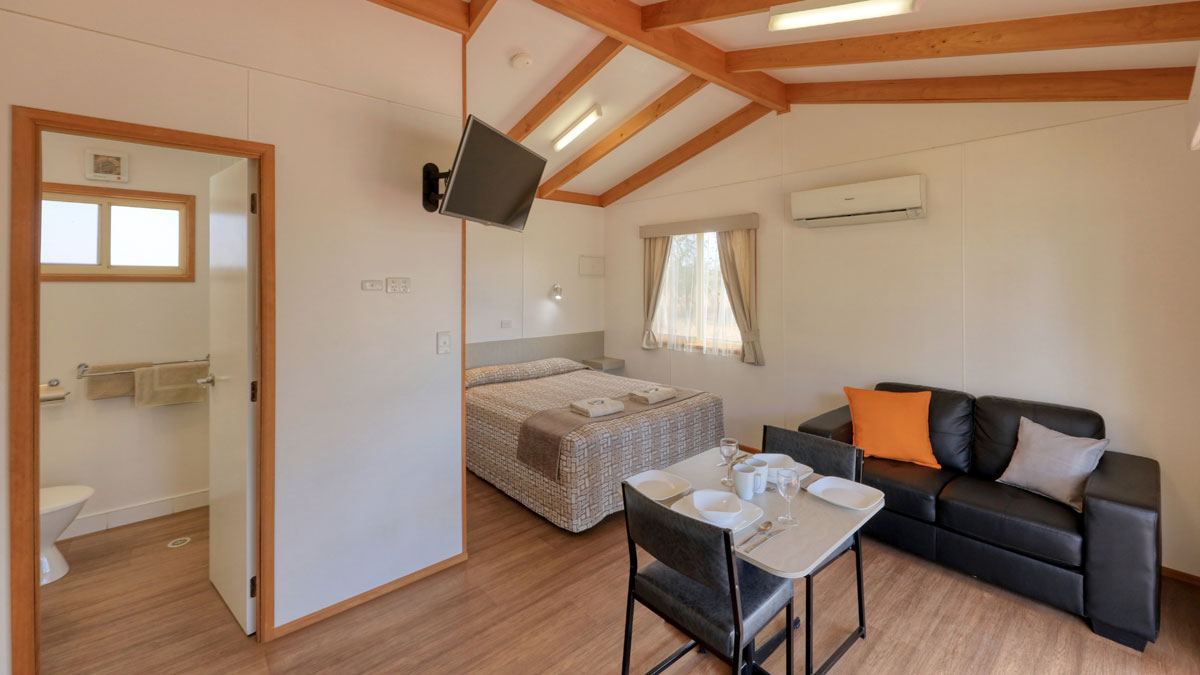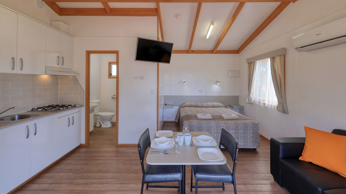 Packed with features, our Studio Cabin has everything conveniently on hand in a compact modern layout that's tastefully appointed with contemporary furnishings. There's a gas stove, microwave oven and fridge along with all the utensils, cutlery and crockery necessary to prepare a full meal.